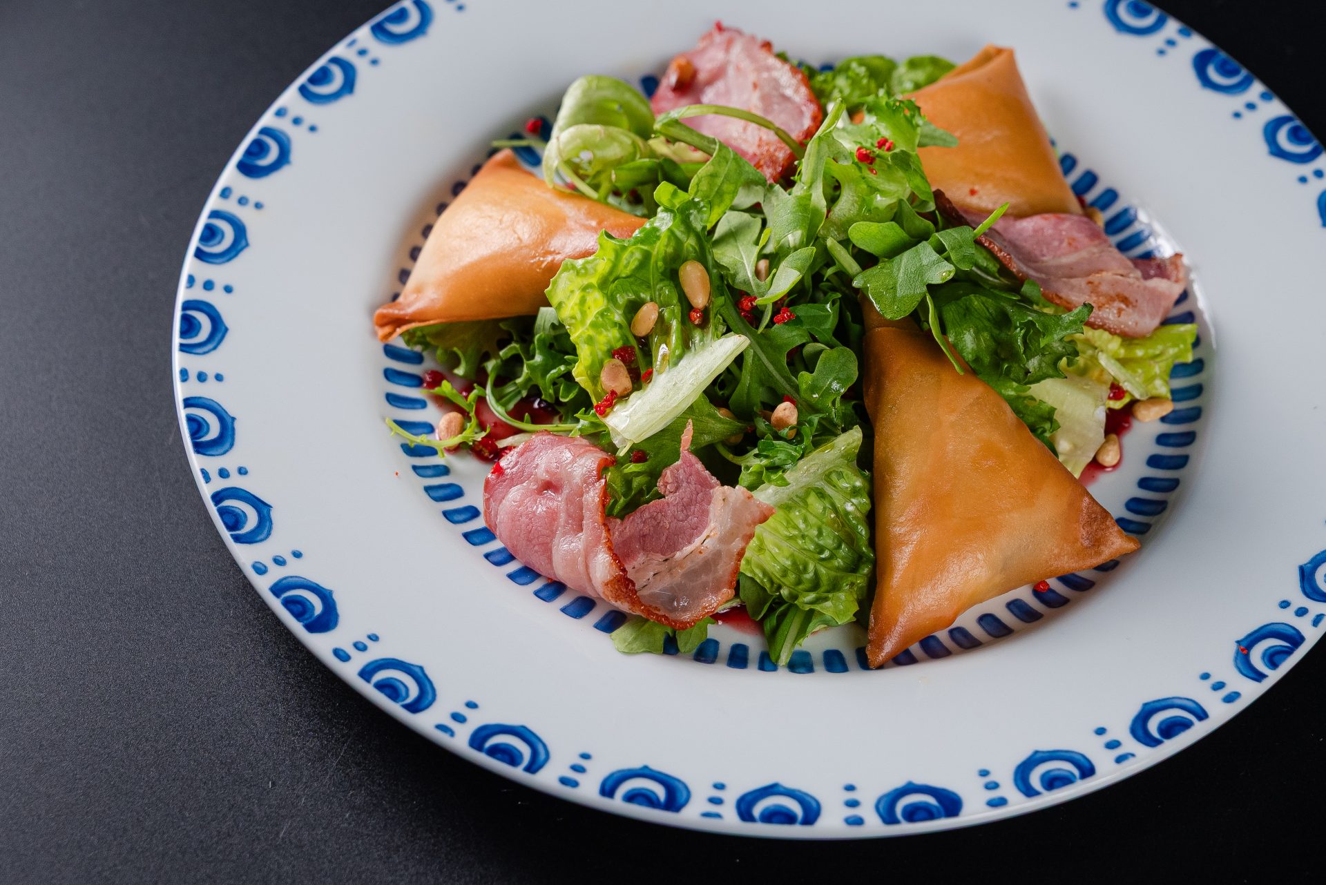 Салат с треугольниками начиненными горячим творогом из козьего молока, бекон, ягоды годжии
